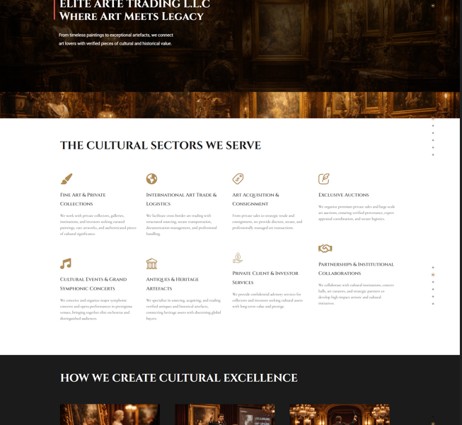 This project covered the full design and development of a modern corporate website for ELITE ART TRADING L.L.C, a UAE-based art and collectibles trading company. The objective was to establish a refined digital presence that reflects sophistication, credibility, and international reach within the art and luxury trading industry.