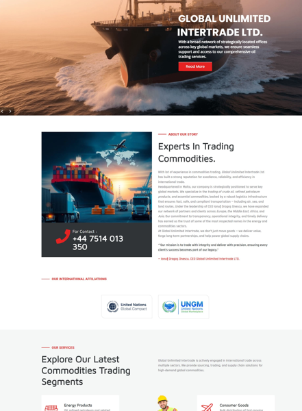 This project covered the full design and development of a modern corporate website for GLOBAL UNLIMITED INTERTRADE LTD, an international commodity and trade solutions company. The goal was to build a strong digital presence that reflects reliability, global reach, and operational expertise within the international trading industry.